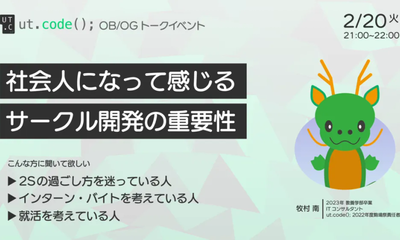 ut.code(); では、2 月 20 日に OB / OG トークイベントを開催しました。今回は 2023 年度に卒業した牧村南さん(仮名)に「社会人になって感じるサークル開発の重要性」というテーマで話していただきました。 牧村さんが学生の時にどのような活動をしていたのかということやサークル開発の重要性、チーム運営のコツなどを話していただきました。 牧村さんが学生の時の活動についての話では、牧村さんがどのようにサークルやバイトと関わってきたのかということやそれぞれをどのように両立していたのかという話をしていただきました。 サークル開発の重要性の話では、個人開発やバイトでの開発経験と比...